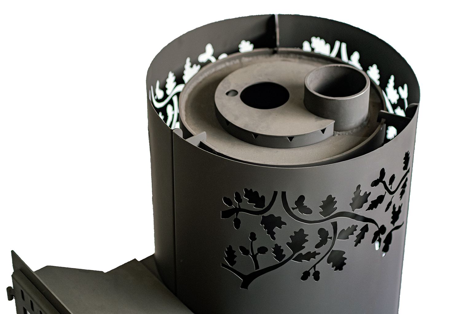 Банная печь «Дубрава» представляет собой стальную конструкцию, выполненную в круглой форме, позволяющая максимально эффективно нагревать парильное и смежные помещения в бане. Отличительной особенностью данной модели является ее уникальная закрытая каменка, которая равномерно нагревается за счет использования винтовой системы дымохода. Внутри каменки нагнетается высокая температура, которая позволяет с высокой скоростью производить нагрев имеющихся камней и удерживать ее на протяжении длительного периода времени. Печь выполнена из стали толщиной 6мм и облицована конвекционным металлическим кожухом, защищающим от инфракрасного излучения.