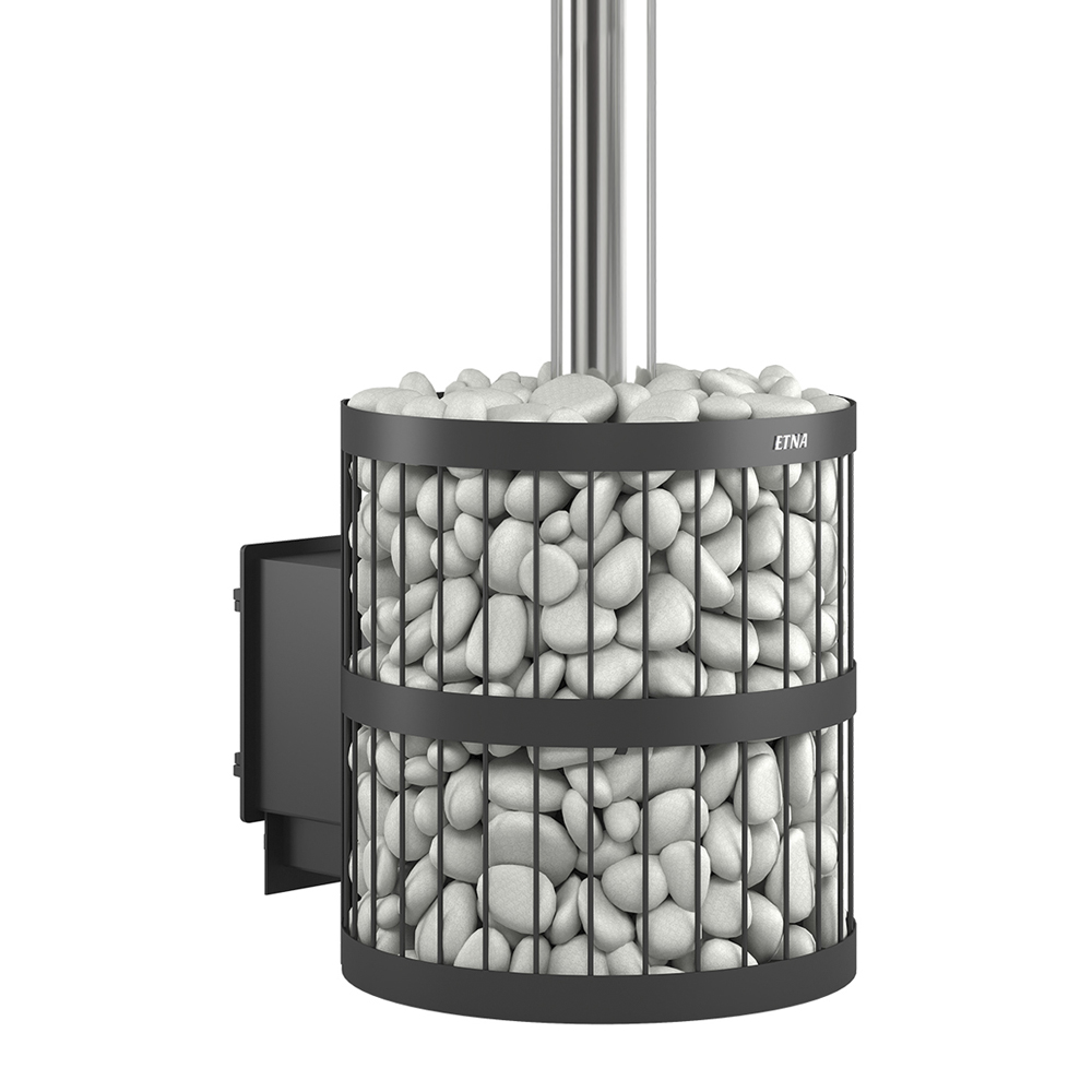 Для устройства наружной открытой каменки печь ЭТНА 18 оснащается металлическим кожухом с прорезным рисунком оригинального дизайна. Пространство между печью и кожухом из двухмиллиметровой стали заполняется камнями для бани, которые выполняют роль теплонакопителя, перераспределяют тепло от стенок топки и защищают парящихся от жёсткого инфракрасного излучения. Воду подают на нагретые камни, с которых полученный пар распространяется по всему объёму парной. Кожух диаметром 560 миллиметров вмещает в себя до 110 килограммов камней крупной и средней фракции.